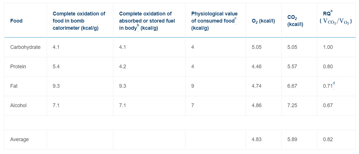RQ 是 CO2(二氧化碳)产量与 O2(氧气)消耗量之比。RQ 为 1 表示 100% 碳水化合物氧化,而一般值为 0.7 表示 100% 脂肪酸氧化(值范围在 0.69 和 0.73 之间,取决于氧化脂肪酸的碳链长度)。