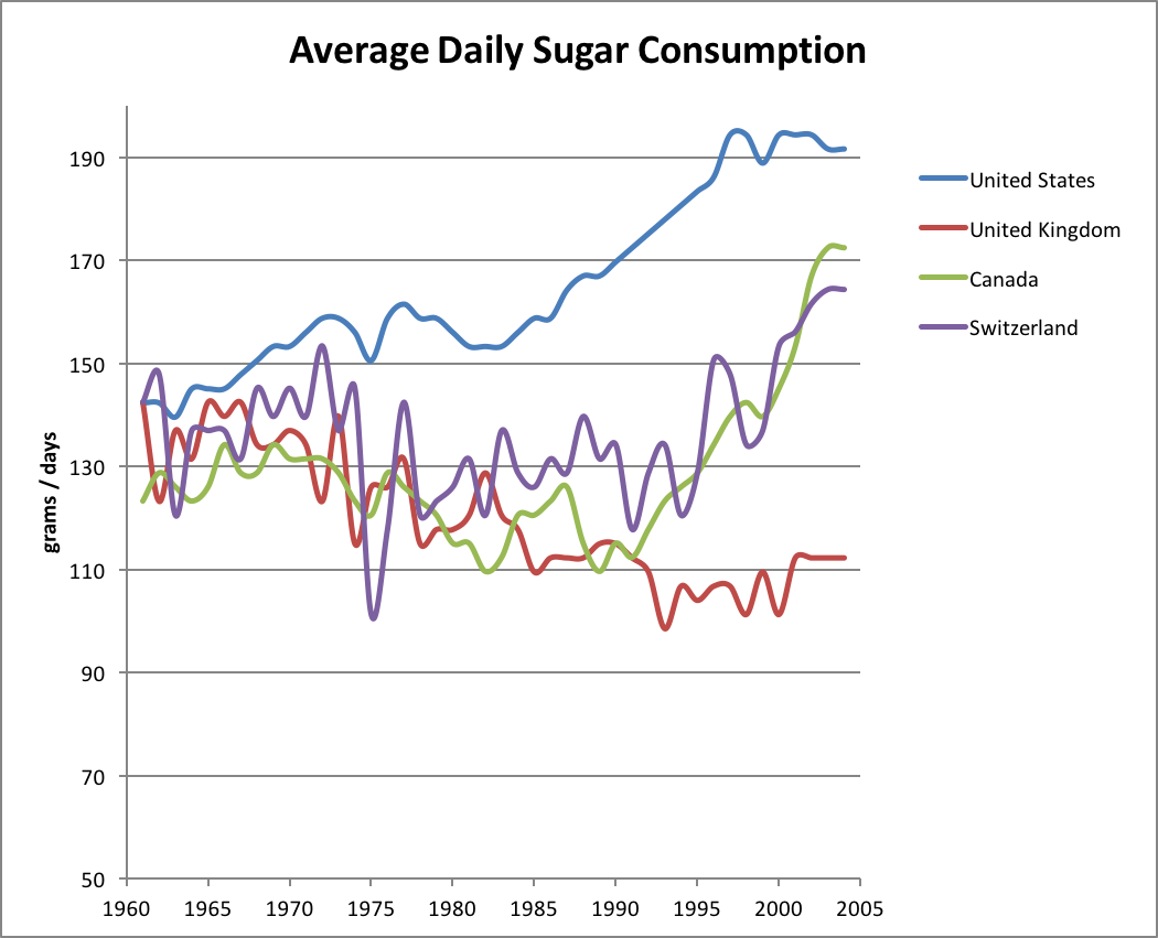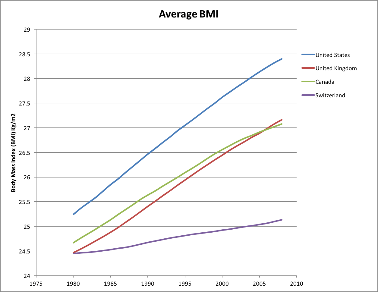 让我们考虑一下美国、加拿大、英国和热爱巧克力的瑞士正在发生的肥胖趋势。这种趋势模式非常具有启发性。