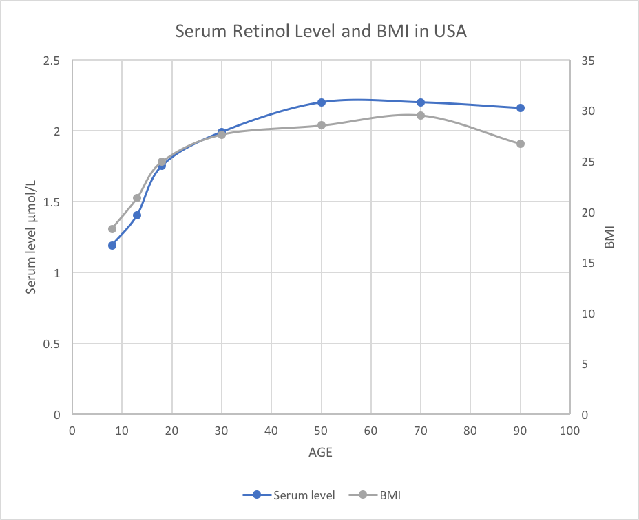 韩国血清维生素A的平均水平远低于同龄美国人。相应地,BMI 水平也是如此。也许更重要的是,韩国的平均 BMI 水平在很宽的年龄范围内都相当稳定,在 60 岁时只会略微上升。因此,高于 1.5 µmol/L 的血清水平可能是危险的,而低于通过身体的常规防御机制更安全地管理。